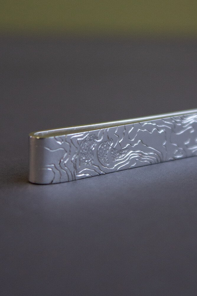A bespoke 8mm wide silver & 18ct gold tie slide. Hand engraved with the contour lines of the landscape from Fulwood to Redmires Reservoirs, on the western edge of Sheffield and into the Peak District.