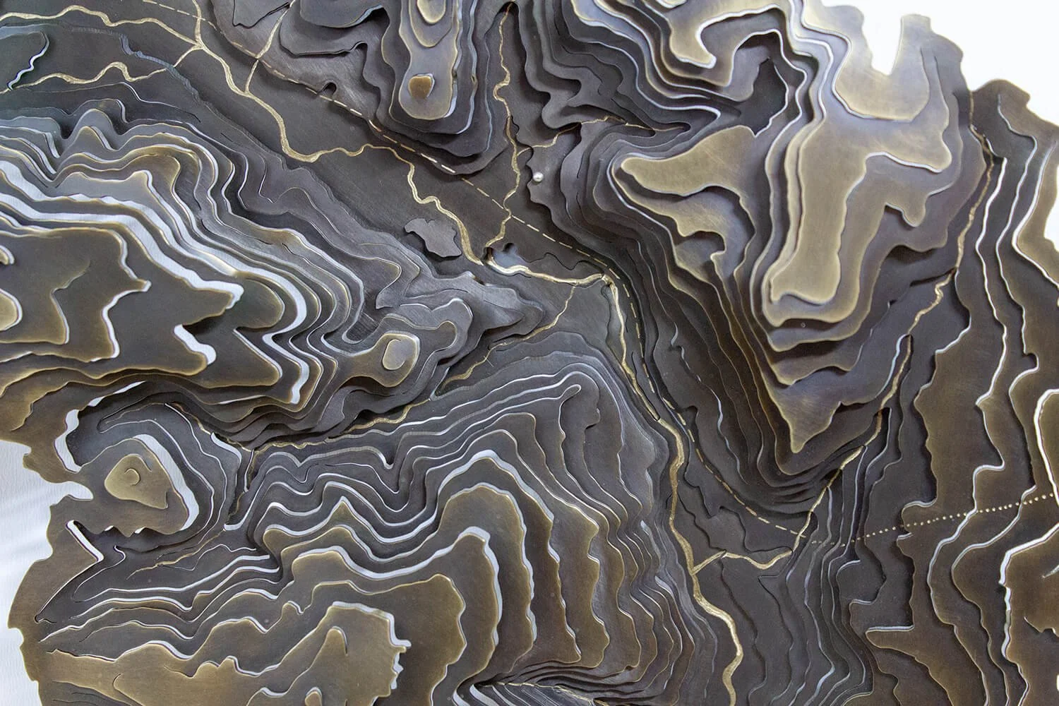 got in touch to request a personalised version of my Hope Valley contour wall map, detailed with the train line running through the countryside, and a marker for the lido at Hathersage. Respectively a favourite mode of transport into the area, and his family’s beloved outdoor swim spot over the years. The train line was engraved, using long dashes to show the above line track, and dots for the section in the Totley tunnel. A subtle silver granule marks the pool at Hathersage.