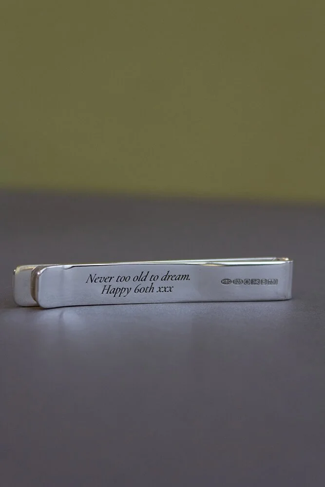 Available in widths from 5-10mm, your tie slide can be personalised with silver or gold granules to mark special points, or even set with stones for extra significance. A hidden message, date or initials can also be engraved discreetly on the reverse.