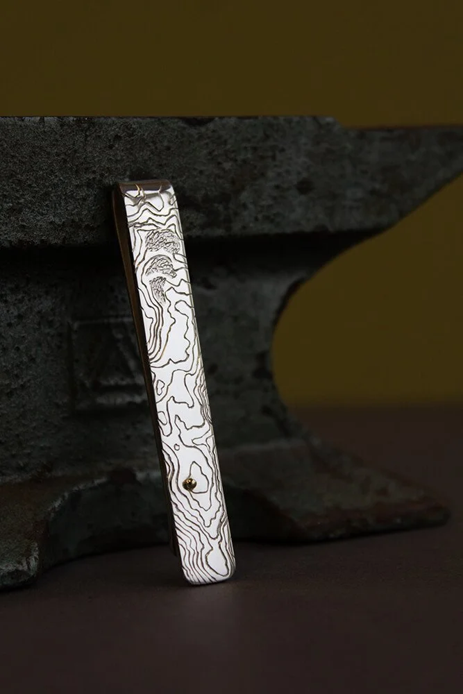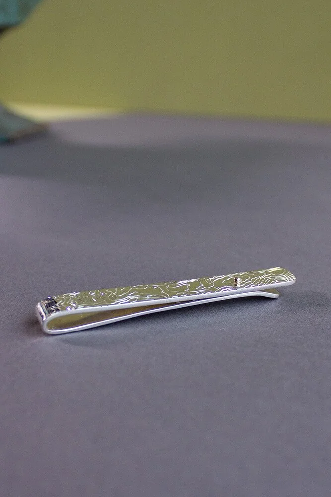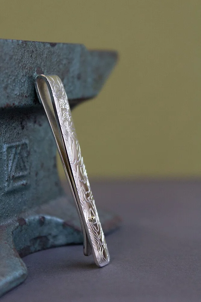 Each contour map tie slide is handmade in my Sheffield workshop, where I engrave every line by hand using a traditional Japanese hammer-and-chisel technique. Fully bespoke, these pieces can capture any meaningful location, from a wedding venue or hometown to a favourite mountain or place of celebration.
